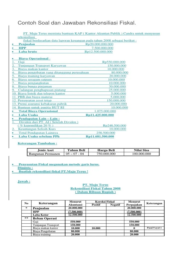 Contoh Soal Dan Jawaban Rekonsiliasi Fiskal Perusahaan Jasa. Rekonsiliasi fiskal, pajak penghasilan badan, spt. Sumbangan untuk karyawati menikah 1.000 ; Dalam gaji dan upah termasuk pph pasal 21 ditanggung perusahaan sejumlah rp425.000.000. Data laporan keuangan tahun 2009 . Biaya yang dihitung / dikeluarkan untuk kepentingan pribadi wajib pajak.
